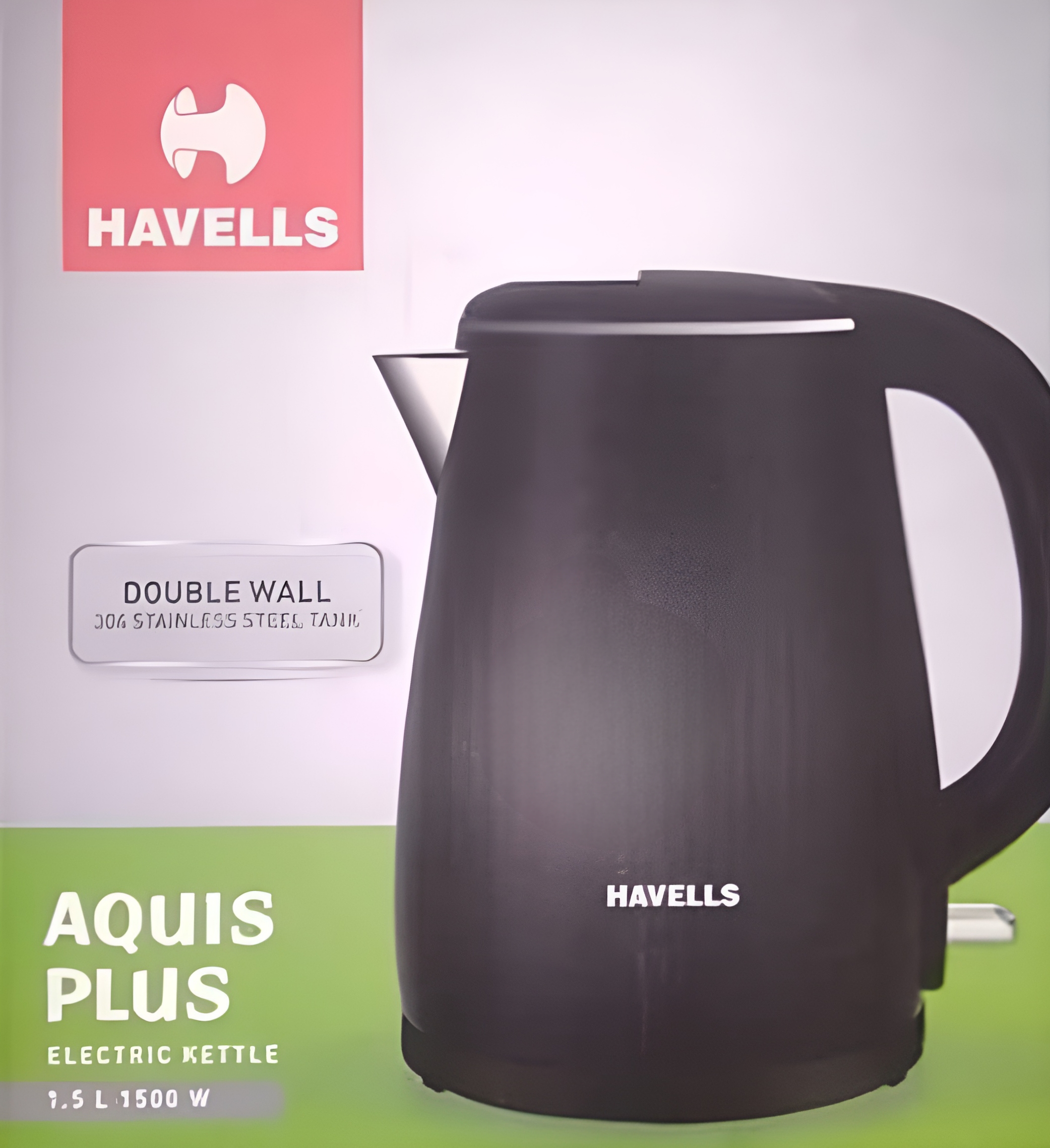 The Havells Aquis Plus Electric Kettle (1.5 L, 1500W) combines safety, style, and performance. With a double wall stainless steel body, 360° cordless base, and auto shut-off protection, it ensures fast and convenient boiling for tea, coffee, or hot water.