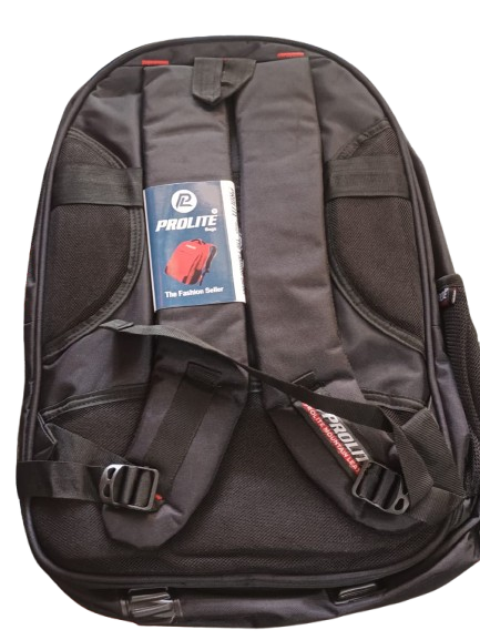 sleek black PROLITE backpack designed for students, professionals, and travelers. Features spacious compartments, durable fabric, and comfortable padded straps, making it ideal for school, office, or casual use.