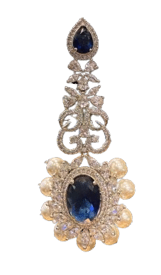 Add a regal touch to your look with these royal blue bridal earrings, beautifully crafted with a sparkling crystal setting and a striking blue oval gemstone centerpiece. Surrounded by shimmering stones and delicate pearl drops, these earrings exude sophistication and grandeur.