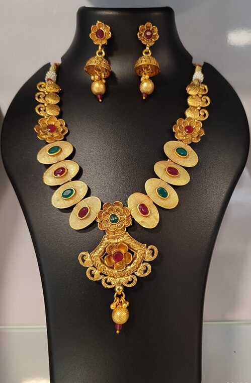 Embrace timeless elegance with this traditional South Indian antique gold-plated necklace set, meticulously crafted with floral and oval-shaped motifs. Highlighted with vibrant red and green stones, this set adds a regal touch to your ethnic wardrobe. The ornate central pendant and coordinated jhumka earrings reflect the grandeur of temple jewellery, making it ideal for weddings, religious ceremonies, and cultural celebrations. Handcrafted with precision, this set ensures both cultural significance and lasting shine.