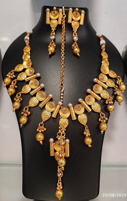 This traditional gold-plated temple necklace set beautifully blends classic Indian craftsmanship with elegant antique styling. The necklace features finely detailed circular motifs paired with a central drop pendant, giving it a regal temple jewelry look.