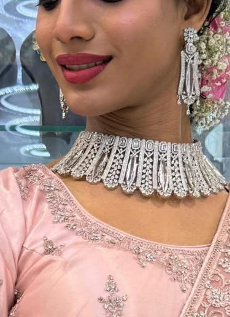 The set includes a grand choker necklace with intricate craftsmanship and matching statement earrings, ensuring a complete bridal or party-ready style. Its high-quality silver plating ensures long-lasting shine, while the comfortable fit makes it suitable for long wear.