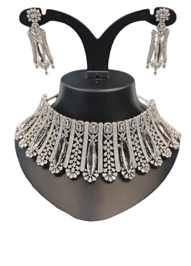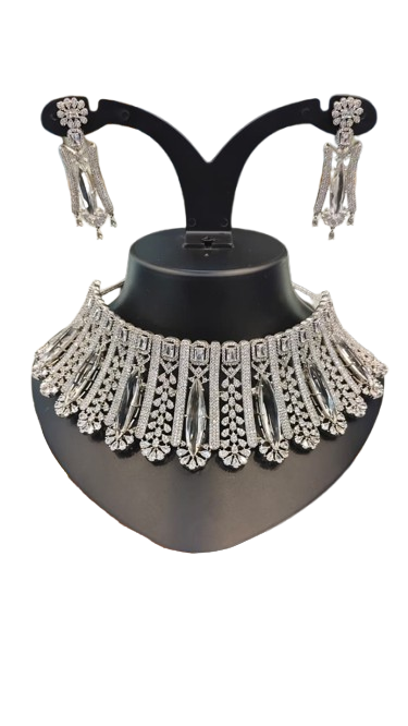 Turn heads at every occasion with this elegant Silver-Plated Bridal Necklace Set featuring a bold and luxurious design. This choker necklace is embellished with shimmering cubic zirconia diamonds and accented with elongated crystal stones, creating a glamorous and modern look.