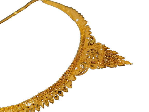 The necklace sits beautifully around the neckline, offering a sophisticated yet glamorous touch, perfect for bridal wear, festivals, or special events. Made from high-quality metal alloy with a radiant gold-tone finish, it is lightweight, comfortable, and skin-friendly.