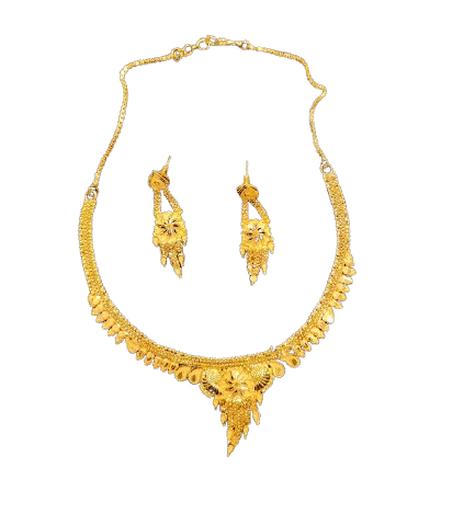 ring timeless elegance to your jewelry collection with this exquisite gold-plated necklace set designed for modern women who cherish tradition. The set includes a delicately crafted necklace adorned with floral and leaf-inspired detailing and is paired with matching long dangler earrings to complete the look.