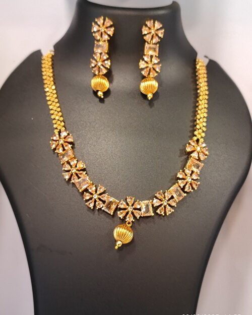 Make a sophisticated style statement with this elegant gold-plated necklace set designed with sparkling square-cut stones and delicate floral accents. The centerpiece features a unique shell-shaped gold pendant, adding a designer twist to the traditional look. Paired with long matching earrings that echo the floral and shell design, this set is perfect for weddings, festive occasions, and evening parties. Lightweight, trendy, and beautifully crafted, it’s the ideal blend of modern aesthetics and traditional charm.