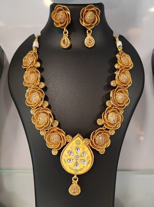 This elegant gold-plated necklace and earrings set features a beautiful floral design, adorned with sparkling stones, making it a perfect accessory for weddings, festivals, or special occasions. The intricate craftsmanship adds a timeless charm to any attire.