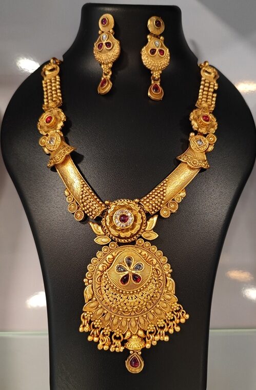 Crafted from premium-quality alloy, the necklace is durable, skin-friendly, and designed to pair beautifully with sarees, lehengas, or ethnic attire. The matching earrings complement the grandeur of the necklace, completing your regal look. This is a timeless jewelry piece that exudes elegance and cultural richness.