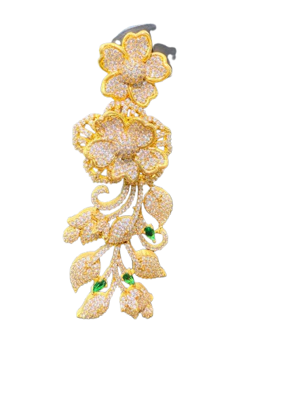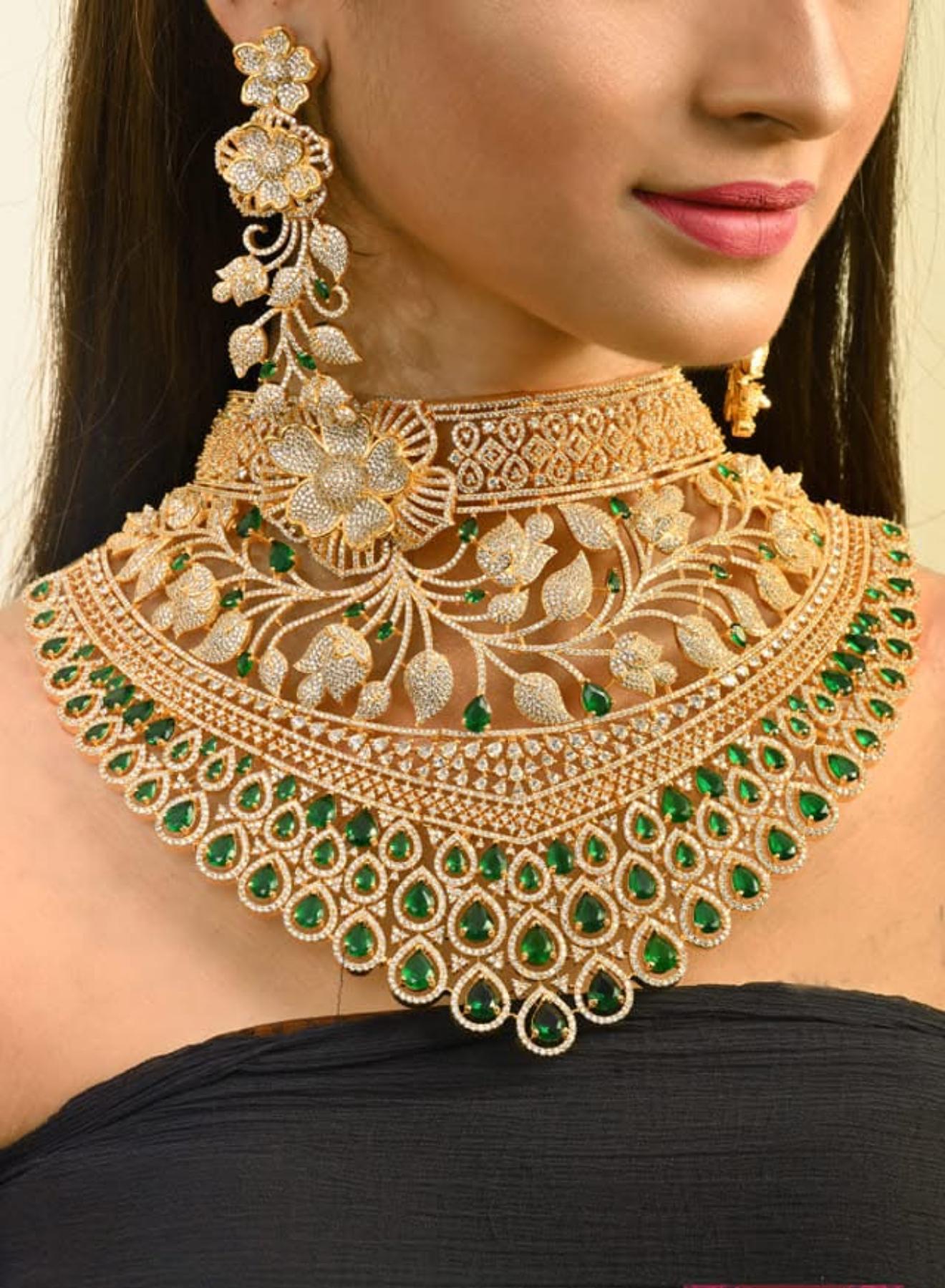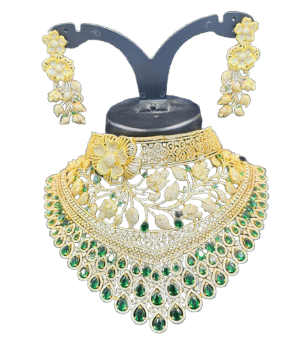 Make a grand statement on your special day with this luxury bridal choker necklace set, beautifully crafted with sparkling white stones and detailed floral patterns. The design is enhanced with elegant emerald green teardrop stones, giving it a regal and timeless charm. This complete set comes with a matching pair of long earrings, designed to complement the choker perfectly.