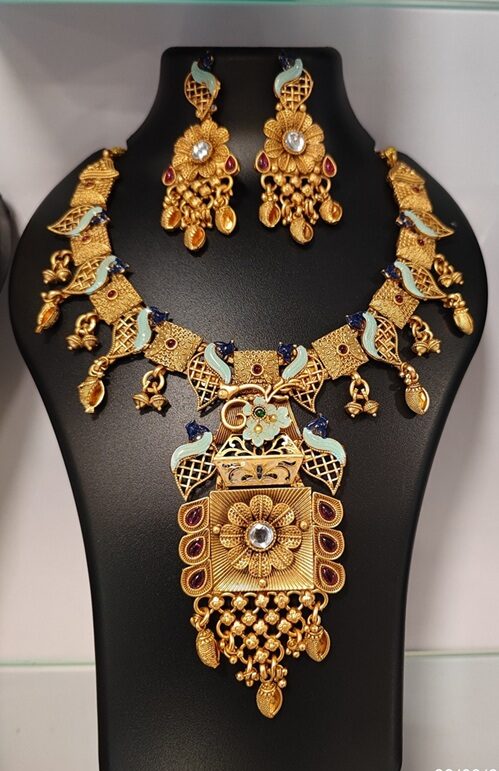 | Design | Traditional temple jewellery with peacock and floral motifs |