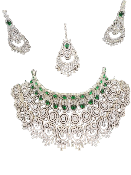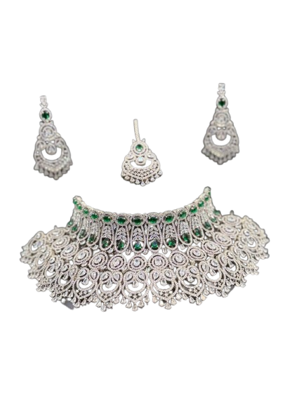 This exquisite choker necklace set features a stunning blend of intricate craftsmanship and regal elegance. The design is adorned with sparkling white stones and rich green accents, creating a luxurious contrast that catches the light beautifully. Perfect for weddings, parties, and festive occasions, this set includes a statement choker necklace, matching earrings, and a delicate maang tikka. Crafted for both comfort and durability, it offers a glamorous look that pairs effortlessly with traditional or modern attire, making it an unforgettable addition to your jewelry collection.