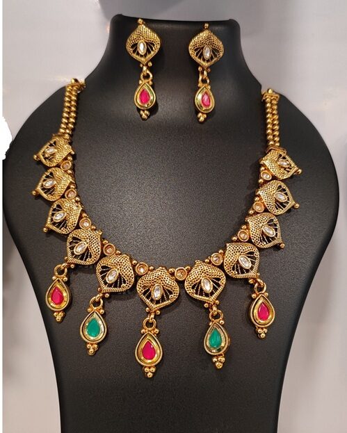 Add a burst of color and elegance to your attire with this stunning gold-plated necklace and earrings set. The design features vibrant pink, green, and white stones set within delicate frames, each surrounded by intricate detailing. The combination of bold and delicate elements makes this set an ideal choice for brides, bridesmaids, or anyone looking to enhance their look for a special occasion.