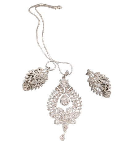 This Traditional Leaf & Floral Jewelry Set combines artistry with elegance, making it a timeless addition to your collection. The set includes a statement necklace with a large pendant beautifully crafted in a floral and leaf-inspired design, paired with matching drop earrings. Made from premium alloy with a sparkling silver-tone finish, it is lightweight yet durable, offering comfort throughout the day. Ideal for traditional functions, weddings, festive events, or as a thoughtful gift, this jewelry set ensures you stand out with charm and grace.