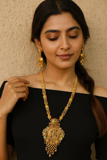 Bring home the grandeur of South Indian heritage with this antique gold plated temple necklace set. Featuring a meticulously crafted central pendant with goddess motifs, surrounded by detailed carvings, green and ruby stones, and hanging gold beads, this jewelry set radiates elegance and tradition.