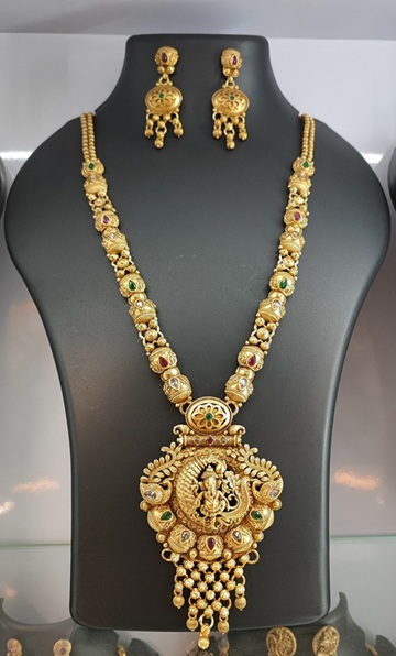 The long necklace design paired with matching jhumka earrings makes it a perfect choice for brides, festive events, and traditional occasions. The high-quality polish ensures durability and a luxurious antique finish, making it an essential addition to your jewelry collection.