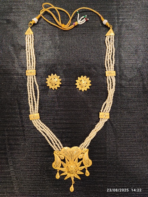 The combination of pearls and gold plating makes this set a perfect match for sarees, lehengas, and traditional outfits. Its lightweight yet intricate craftsmanship ensures comfort along with elegance, making it a must-have jewellery piece for weddings, parties, and cultural celebrations.