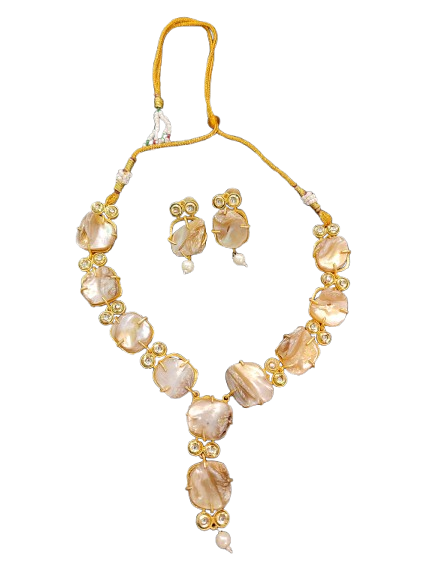 Add a touch of elegance to your festive look with this stunning Gold-Plated Necklace Set with Earrings. The design features unique stone-cut pearls with sparkling crystal accents, beautifully crafted to give a royal and graceful appeal.