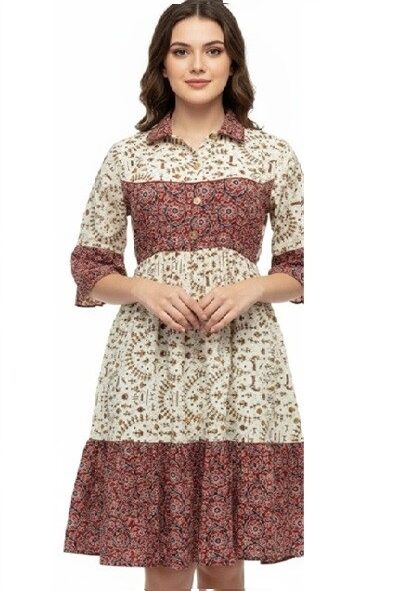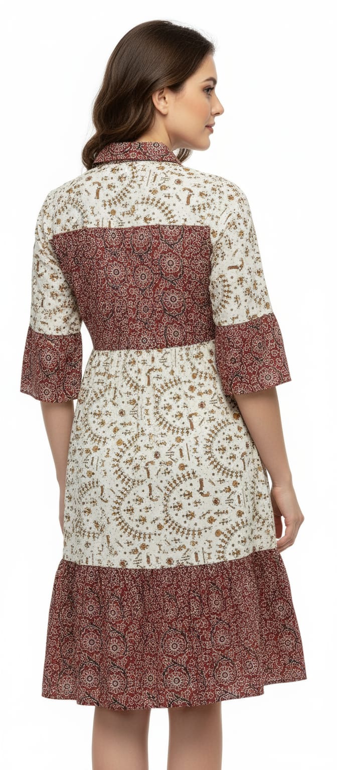The collared neckline, button-down front, and 3/4th flared sleeves give it a graceful silhouette. The rich maroon and cream block print design adds a touch of sophistication, while the tiered hemline gives a flowy and flattering look.