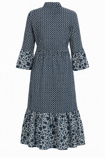 Women’s Cotton Printed Midi Dress – Blue & White Zigzag and Floral Handblock Style Shirt Dress with Wooden Buttons | Elegant Casual Summer Wear