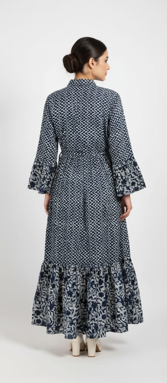 Step into everyday elegance with this women’s blue and white handblock-inspired cotton dress, crafted from premium-quality breathable fabric. This dress combines modern comfort with traditional charm, featuring a unique blend of zigzag and floral prints that create a timeless aesthetic.