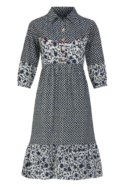 Women’s Cotton Printed Midi Dress – Navy Blue & White Floral and Zigzag Pattern Shirt Dress with Wooden Buttons & Flared Sleeves | Elegant Summer Casual Wear