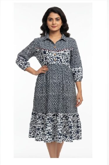 The shirt collar and wooden button front give it a sophisticated touch, while the fit-and-flare silhouette and elasticated waist ensure comfort and shape. The 3/4th sleeves add grace, and the tiered hemline completes the look with effortless style.