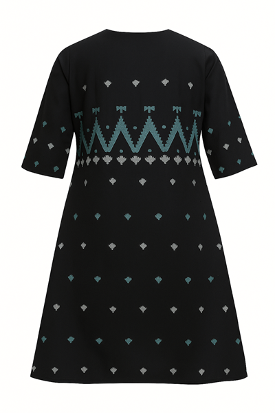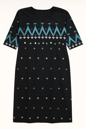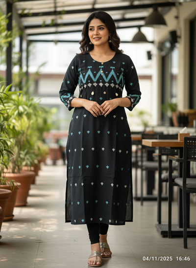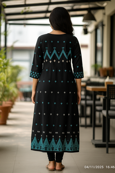 Step out in style with this beautiful black cotton kurti, crafted from soft, breathable fabric that ensures all-day comfort. Featuring eye-catching turquoise and white geometric prints on the front, this kurti beautifully combines traditional artistry with modern design.