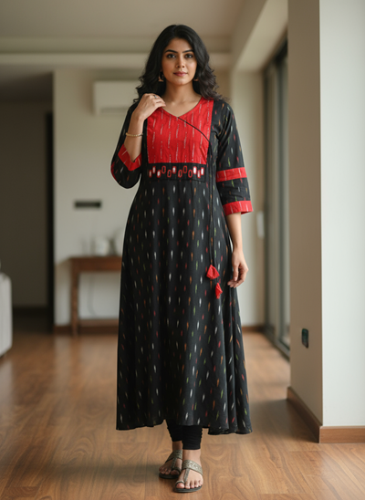 Make a bold yet elegant statement with this beautiful black and red long cotton kurti, featuring a rich combination of colors and patterns inspired by traditional Ikat weaving. The vibrant red yoke and sleeve detailing create a stunning contrast against the black base, giving it a regal ethnic appeal.