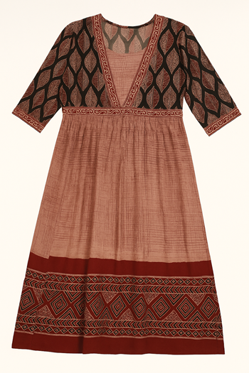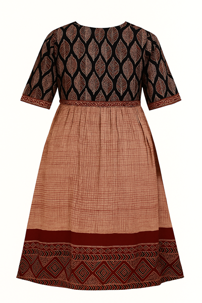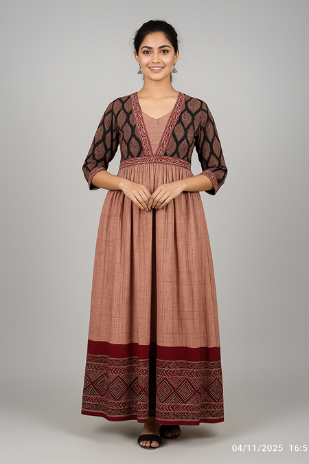 Make a striking statement with this beautiful black and maroon long cotton kurti, designed for women who appreciate timeless ethnic style. The kurti features a printed black yoke with leaf motifs and a contrasting maroon flared bottom adorned with intricate geometric patterns.