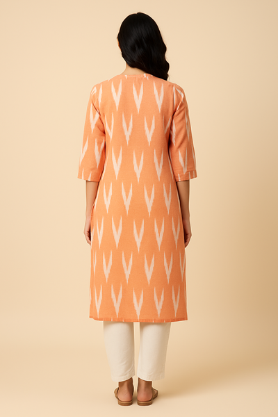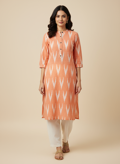 Elegant Peach Ikat Printed Cotton Kurti for Women – Mandarin Collar with Buttons | Office & Casual Wear