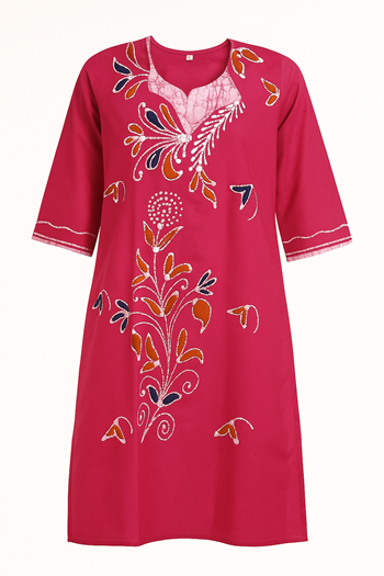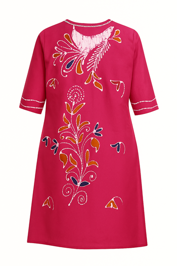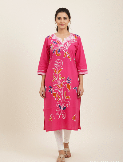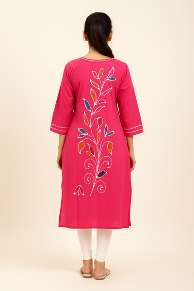 Step into elegance with this beautiful pink embroidered kurti, crafted from premium-quality cotton fabric for all-day comfort. The intricate multi-color floral embroidery on the front adds a vibrant touch, while the three-quarter sleeves and straight-cut design create a flattering silhouette.