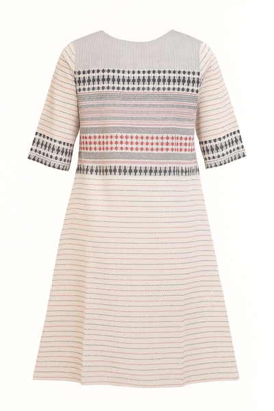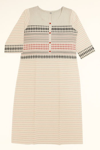 Step into effortless style with this beautiful white and grey cotton kurti, crafted with precision to balance comfort and class. The subtle striped pattern across the length is complemented by a colorful geometric print on the yoke, giving it a unique and refined appeal.