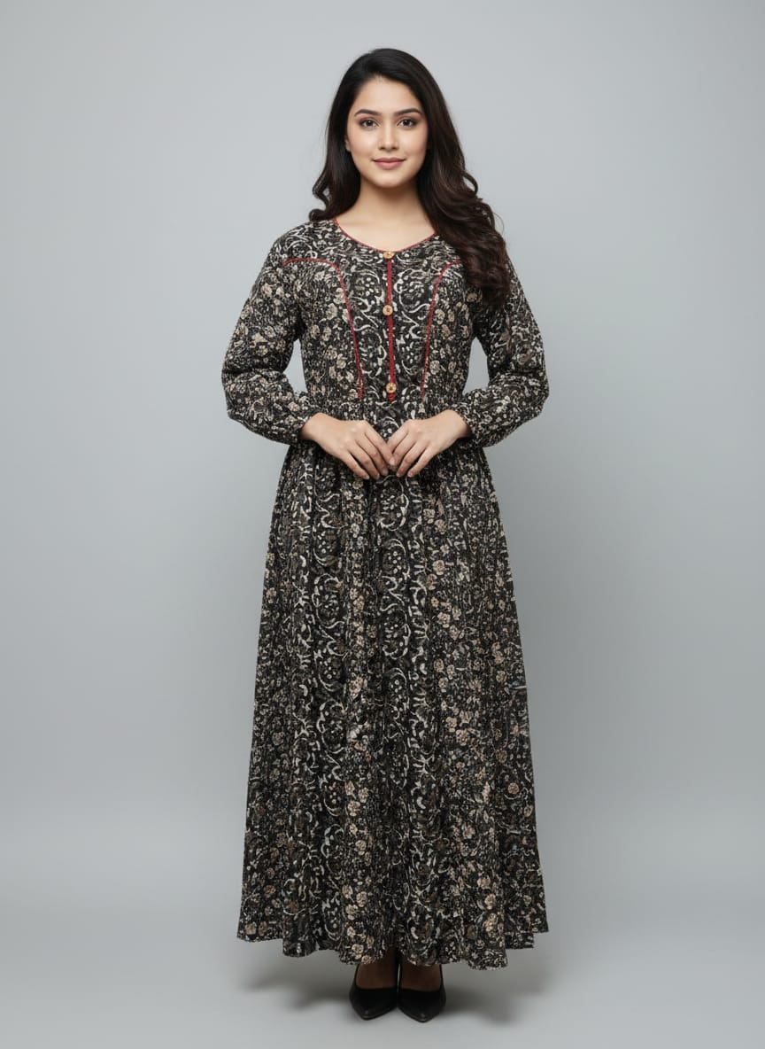 Look effortlessly graceful with this elegant black floral printed Anarkali kurti. Designed with long sleeves, wooden buttons, and a flattering fit, this ethnic gown is perfect for festive occasions, parties, and everyday elegance.