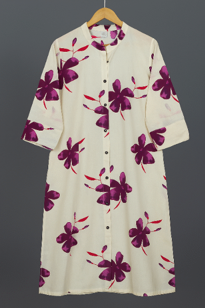 Elegant white cotton kurti featuring bold purple floral prints and button-down design. Perfect for casual, office, and festive wear. Comfortable, breathable, and stylishly crafted for all-day wear.