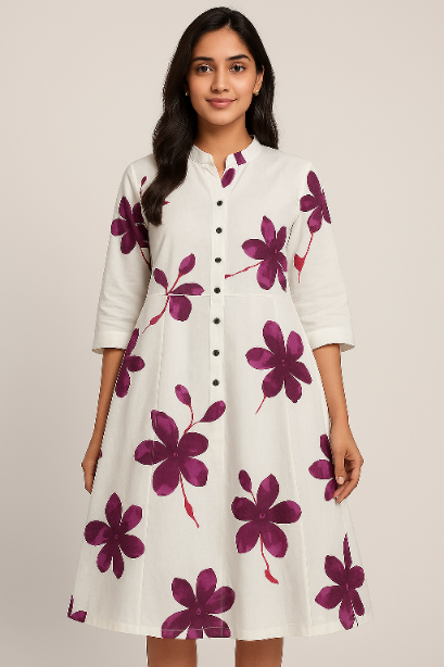 Upgrade your ethnic wardrobe with this beautiful white cotton kurti adorned with striking purple floral prints. Designed in an A-line silhouette with a button-down front and 3/4th sleeves, this kurti blends comfort with elegance. The soft cotton fabric makes it breathable and perfect for long hours, while the vibrant floral design adds a trendy touch. Ideal for office, casual outings, festive gatherings, or daily wear, this kurti pairs well with leggings, palazzos, or jeans. Stay fashionable and comfortable with this versatile wardrobe essential.