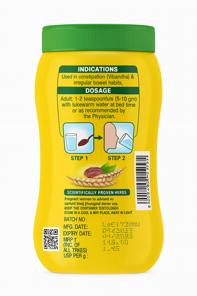 | Indications | Constipation (Vibandha), irregular bowel habits |