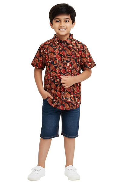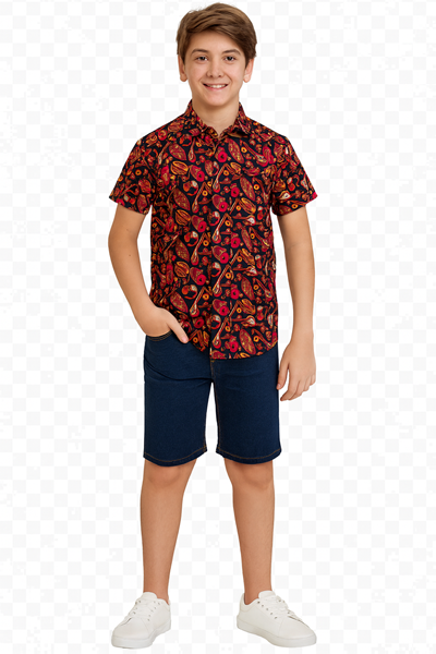 The eye-catching multicolor print features traditional musical instruments like tabla, sitar, and dhol, giving it a fun and cultural twist. The shirt includes a classic collar and front button closure, offering a stylish yet comfortable fit — ideal for summer wear, parties, and family gatherings.