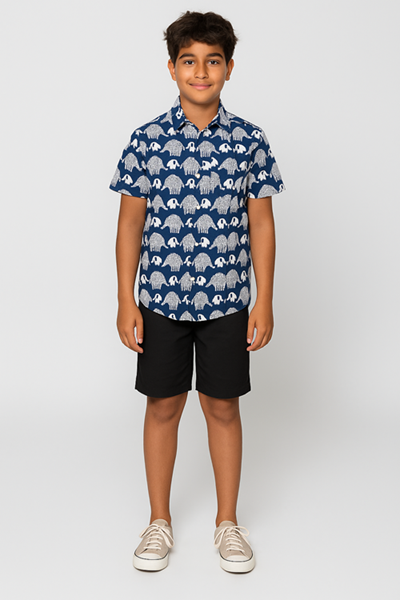 Add a fun touch to your child’s wardrobe with this boys’ blue elephant print cotton shirt, designed for both comfort and cuteness. Made from premium-quality cotton fabric, this half-sleeve shirt ensures breathability and comfort, keeping your child cool all day long.