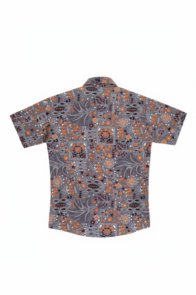 The unique floral and geometric print pattern in shades of orange, white, and maroon gives it a trendy yet traditional touch. Designed with a button-down front, spread collar, and short sleeves, this shirt combines smart style with easy wearability. Whether it’s for casual outings, birthday parties, or festive gatherings, this shirt is sure to make your little one look stylish and confident.