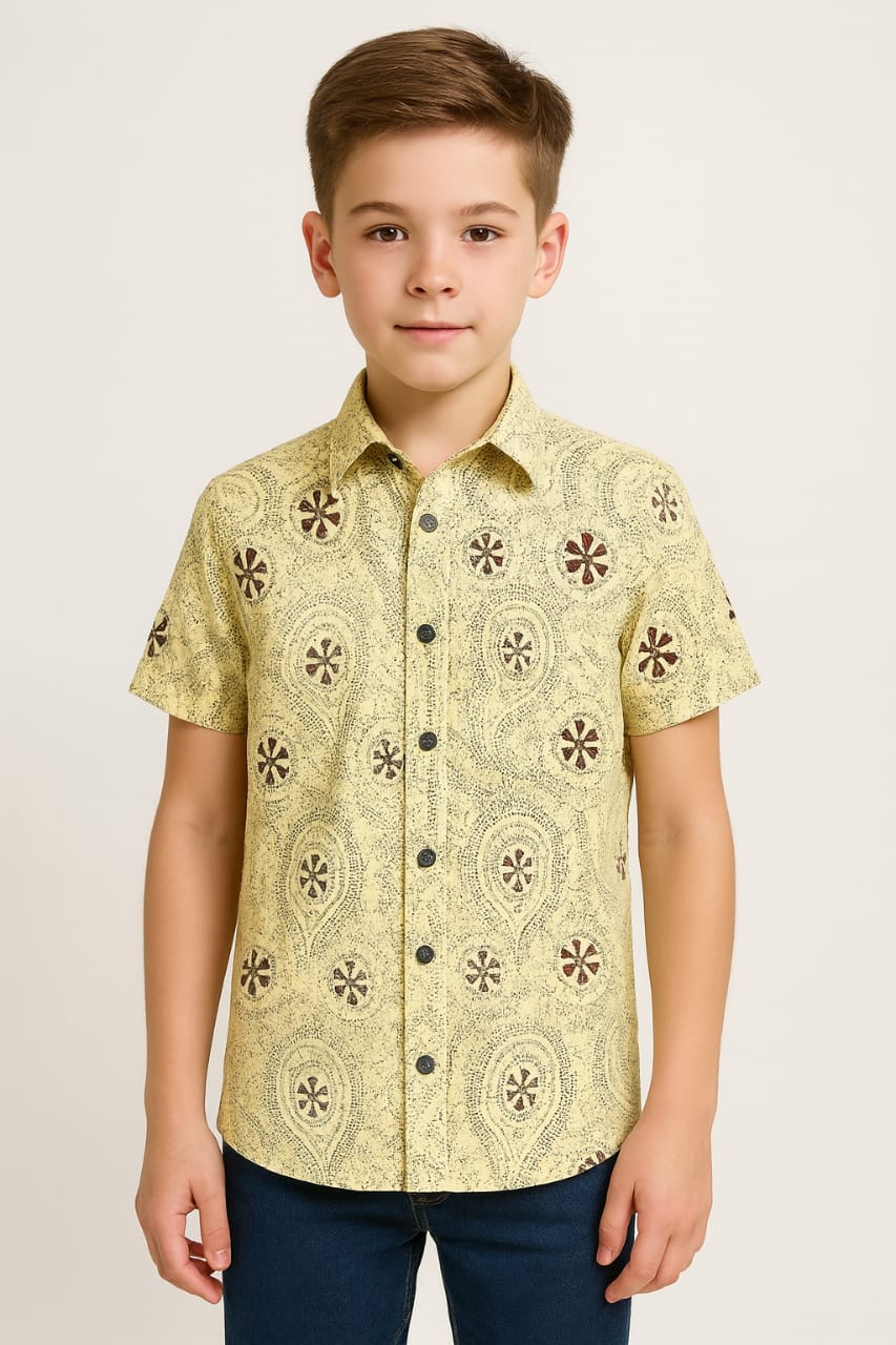 Designed for boys aged 7 to 12 years, this cotton shirt combines ethnic charm with modern casual style. The Katha stitch-inspired print in a cheerful yellow shade makes it stand out, while the breathable cotton fabric ensures all-day comfort. Its half-sleeve, button-down design with a smart collar and pocket makes it versatile for both festive and everyday wear. Pair it with jeans, shorts, or traditional bottoms for a stylish look that your boy will love to wear on any occasion.