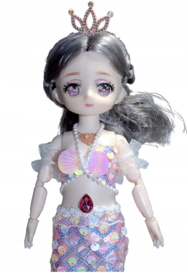 This is a beautifully crafted mermaid princess doll, featuring long wavy silver hair and large sparkling anime-style eyes. She wears a shimmering pastel mermaid outfit adorned with iridescent seashell accents, sequins, and pearls. A glittering pink gemstone decorates her waist, while her head is crowned with an elegant bejeweled tiara. Perfect for collectors or children who love fantasy and ocean-themed play.