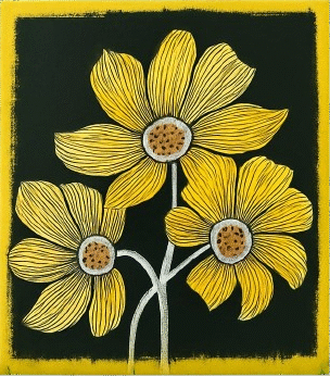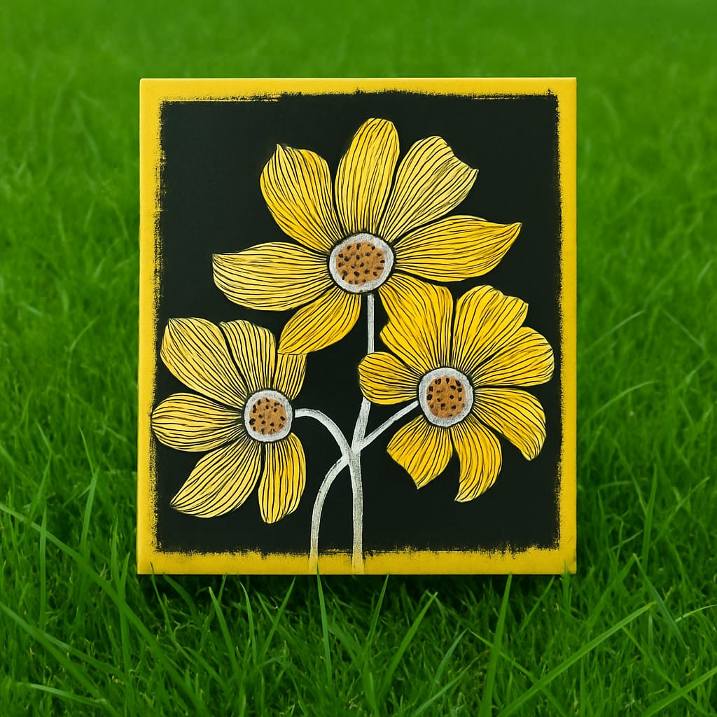 A burst of sunshine to your space with this vibrant canvas wall hanging. Featuring three beautifully hand-painted yellow flowers with intricate petal details set against a bold black background, this piece creates a striking contrast that instantly catches the eye. The yellow border enhances the overall warmth and charm of the artwork.