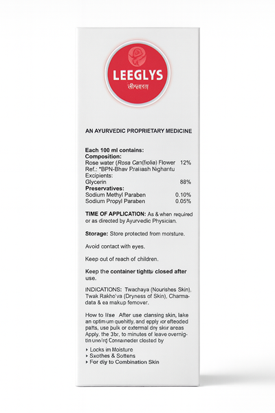 Leeglys Glycerin with Rose Water is an Ayurvedic multipurpose skin protectant that deeply moisturizes, softens, and soothes dry and rough skin. Ideal for face, hands, feet, and sensitive areas, it helps nourish the skin, prevent dryness, and provide lasting hydration.
